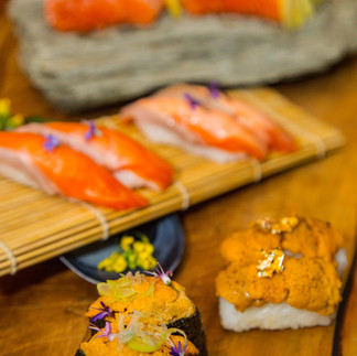 El chef Jin-Sun Yoo, al frente de Omakase, una dark kitchen en Valdivia, llegó con sus preparaciones japonesas de sashimi de salmón del mercado de Castro en sus versiones con flor de romero y aburi (previamente braseado), además de recetas de erizo en gunkan y nigiri con laminado de oro comestible. “La idea fue que aprendieran desposte y fileteo del pescado. Todo con el fin de instarles a que no tengan miedo de enfrentar productos locales con técnicas japonesas”.